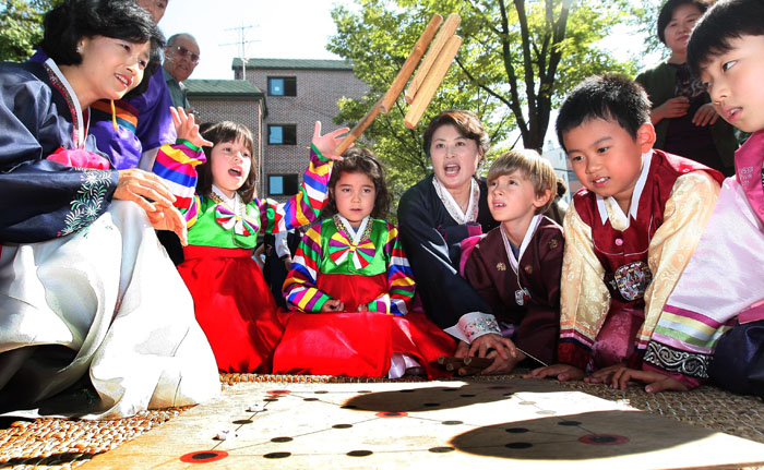 Vào ngày Tết truyền thống có thể bắt gặp quang cảnh người Hàn mặc Hanbok và chơi các trò chơi dân gian ở khắp nơi. Trong hình trên, các em nhỏ đang thích thú chơi Yut nori. (Ảnh: Yonhap News).