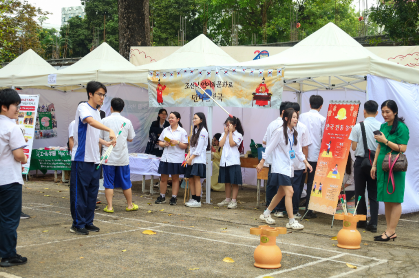 🌟 Tại gian trải nghiệm, các bạn học sinh đã có cơ hội mặc Hanbok, chụp ảnh và tham gia các trò chơi dân gian như ném tên Tuho, đập giấy Ttakji, Gongginori, qua đó thêm hiểu hơn về văn hóa truyền thống Hàn Quốc 🇰🇷